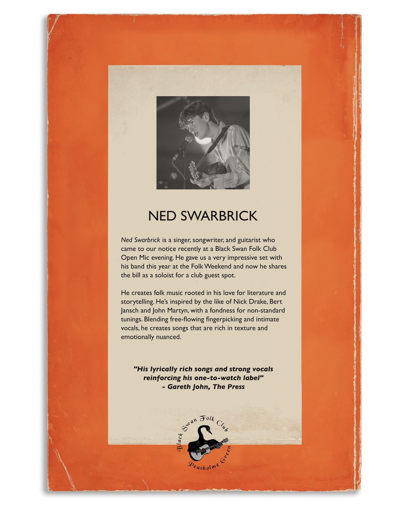 I first played at the Black Swan Folk Club at their Open Mic evening back in January'25 and later in the year at the Folk Weekend with the band. Really excited about heading back there for a solo set in October along side The Rattlers - mixing up the traditional with contemporary for what's guaranteed to be a great night.